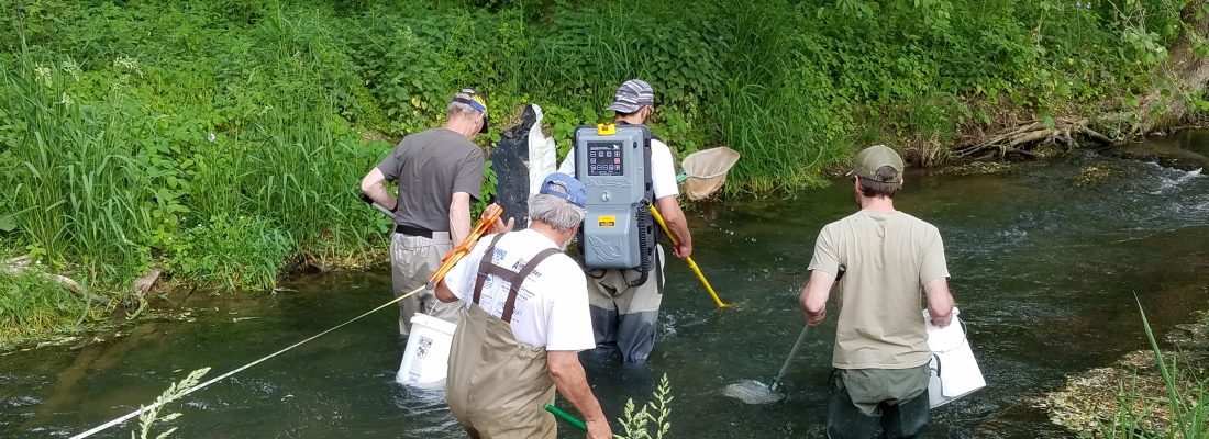 Mifflin County Conservation District partnered with local DEP biologist Matt Shank to host an educational electrofishing field seminar designed to educate local landowners on the importance of stream projects such as riparian buffer plantings and the installation of fish habitat structures. The event was held on a farm outside of Belleville where a riparian buffer planting and fish habitat structures were installed in the summer of 2017. The seminar consisted of electrofishing approximately 100 meters of the property – netting fish – and placing them in buckets to be examined. Fish were then identified and their function in the ecosystem and significance to Kishacoquillas Creek were explained. Pollution sensitivity in species captured was discussed as well as how the fish habitat and riparian buffer projects directly benefit aquatic life.