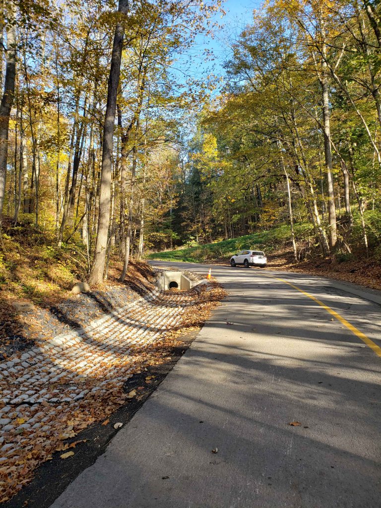 For this project it was not possible to reduce flows entering the road system, often the preferred strategy of road maintenance, so efforts were taken to manage the flows to reduce ditchline erosion and subsequent sedimentation of the receiving waters (Honey Creek).  After proper ditchline shaping and preparation, Armagh Township staff installed nearly 700 feet of Flexamat concrete block matting to stabilize the ditchline.  Flexamat matting contains gaps between the blocks thus allowing vegetation to establish and grow between the blocks as time passes, creating an area that withstands high flow events and promotes infiltration of surface flows.