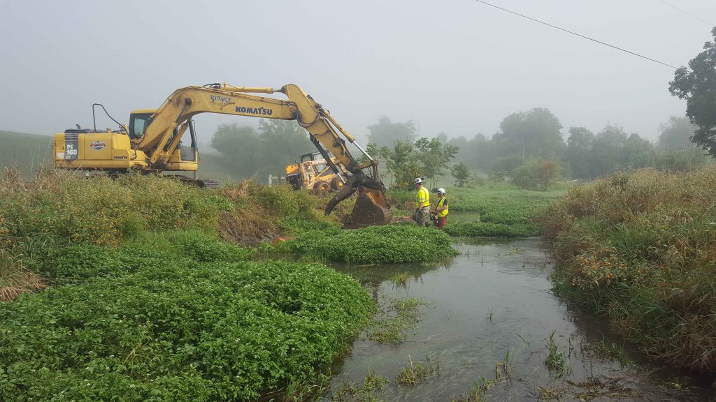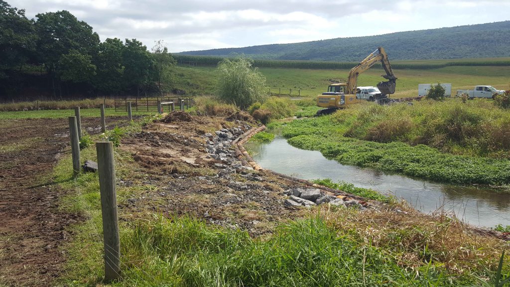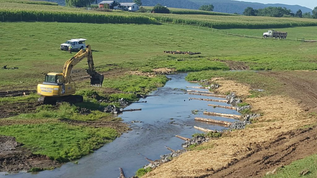 The Mifflin County Conservation District completed three fish habitat projects in the Upper Kish Watershed this summer with help from the Pennsylvania Fish and Boat Commission (PFBC) and funding from the National Fish and Wildlife Foundation (NFWF). These projects are part of ongoing efforts to restore the streams in the Upper Kish watershed from multiple impairments. Fish habitat has become an important focus for the District, working together with the PFBC Habitat Division and the Penn’s Creek Chapter of Trout Unlimited to improve the cold water fisheries of Mifflin County.